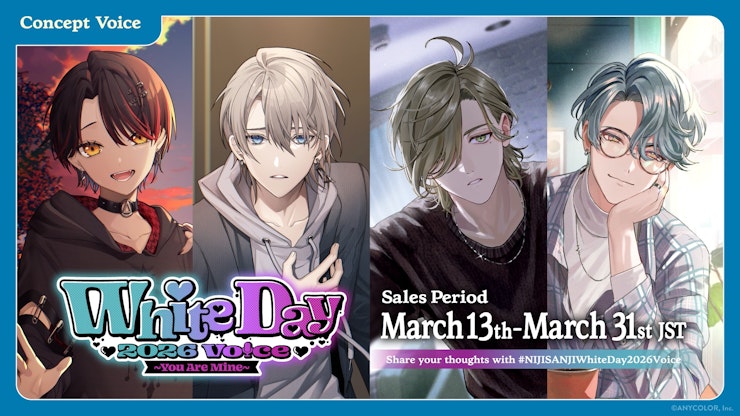 2026年3月13日(金)12時から2026年3月31日(火)23時59分までの期間、にじさんじオフィシャルストア(https://shop.nijisanji.jp)と、NIJISANJI EN Official Store(https://nijisanji-store.com)にて「にじさんじ ホワイトデー2026ボイス~You Are Mine~」「にじさんじ ささやき寝かしつけボイス」の販売をいたします。