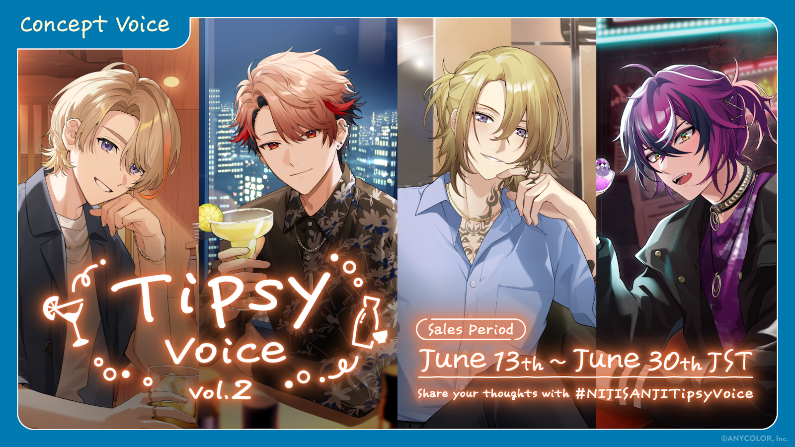 Operated by ANYCOLOR Inc., NIJISANJI EN announces the release of new “Tipsy Voice vol. 2” packs. “Tipsy Voice vol. 2” packs will be available on the NIJISANJI EN Official Store starting from June 12 (Thu) 20:00 PDT!