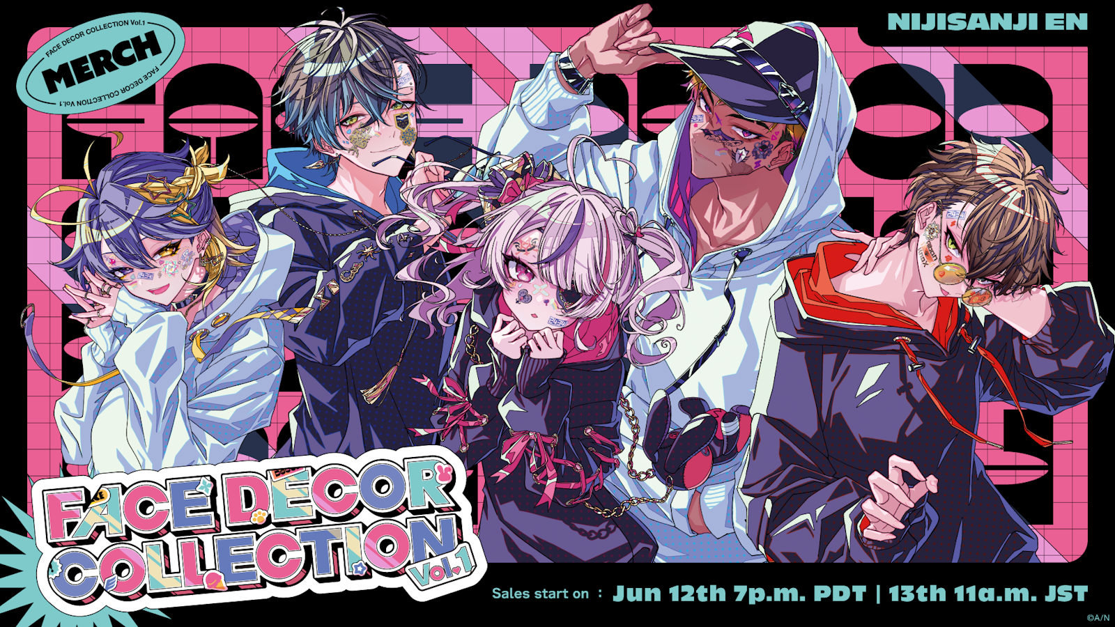 Operated by ANYCOLOR Inc., NIJISANJI EN announces the release of new “FACE DECOR COLLECTION Vol.1” theme merchandise. “FACE DECOR COLLECTION Vol.1” merchandise will be available on the NIJISANJI EN Official Store starting from June 12th (Wed), 19:00 PDT!