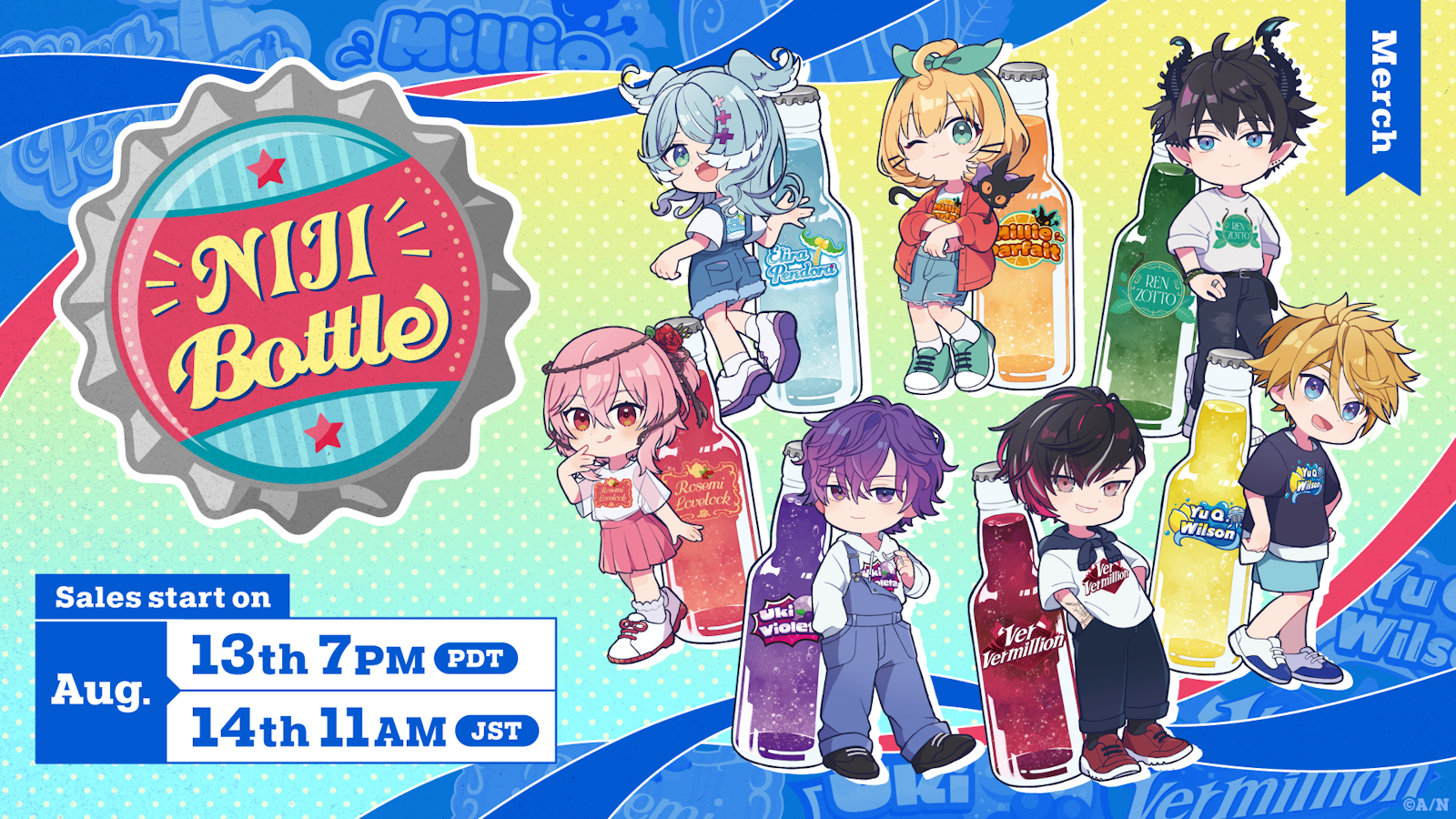 Operated by ANYCOLOR Inc., NIJISANJI EN announces the release of new theme merchandise featuring NIJISANJI EN Livers. ”NIJI Bottle Vol.1” merchandise will be available on the NIJISANJI EN Official Store starting from August 13th (Tue), 19:00 PDT!