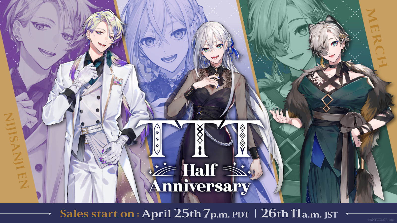 Operated by ANYCOLOR Inc., NIJISANJI EN announces the release of new merchandise featuring the VTuber group “TTT”, which comprises Claude Clawmark, Victoria Brightshield and Kunai Nakasato. “TTT Half Anniversary” merchandise will be available on the NIJISANJI EN Official Store starting from April 25th (Thu), 19:00 PDT!