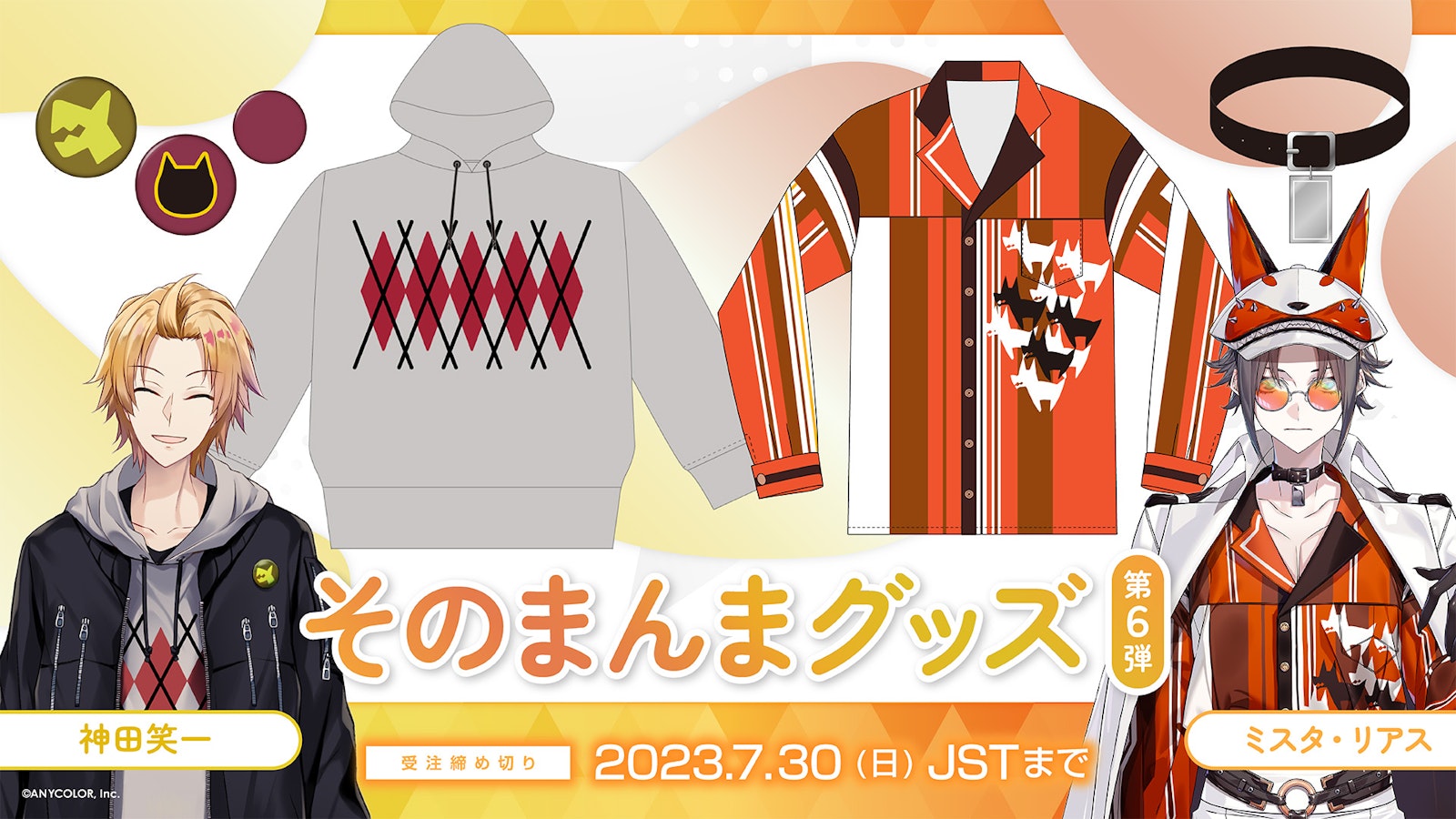 第6弾では、にじさんじ「神田笑一」、NIJISANJI EN「ミスタ・リアス」のアパレルアイテムをグッズ化!