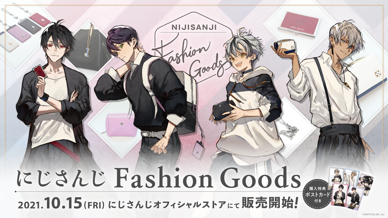 「にじさんじFashion Goods」キービジュアル4名のライバーが ”身につけている” もしくは ”持っている” グッズと、バッグチャームには、100mm×148mmサイズのポストカードが特典として付きます。