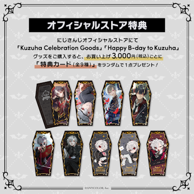「Kuzuha Celebration Goods」「Happy B-day to Kuzuha」のタグがついている商品を税込3,000円お買い上げ毎に「特典カード(全9種)」をランダムで1点プレゼントいたします。