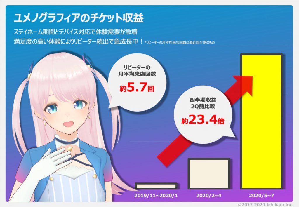 ユメノグラフィアは、チケット収益において2020年4月期4Qは前四半期比527%、2021年4月期1Qは前四半期比445%、直近の2四半期で約2340%となりました。また、2021年4月期1Qにおけるリピーターの月平均来店回数は約5.7回と高い満足度の熱狂体験となっており、サービスが急拡大しております。