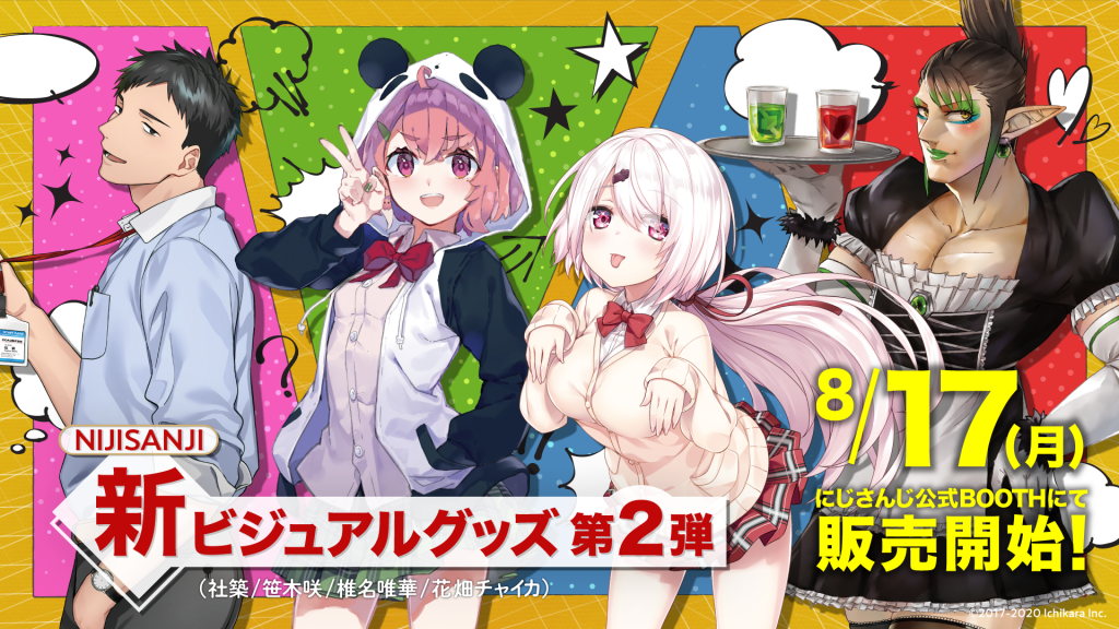 「にじさんじ」ライバー4名(社築、笹木咲、椎名唯華、花畑チャイカ)の新ビジュアルイラストを使用した、大判アクリルスタンド、ランダム缶バッジ 2種類のグッズ販売を8月17日(月)12時より行います。また、今後も新ビジュアルを公開しているライバーのグッズを発表する予定です。