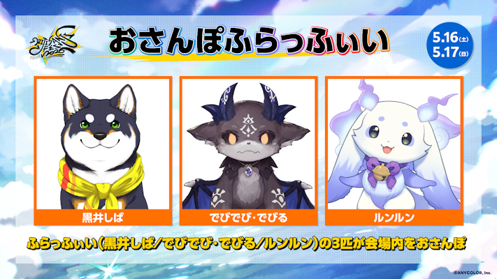 ふらっふぃい(黒井しば / でびでび・でびる / ルンルン)の3匹が会場内をおさんぽします!