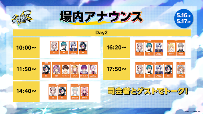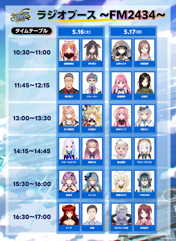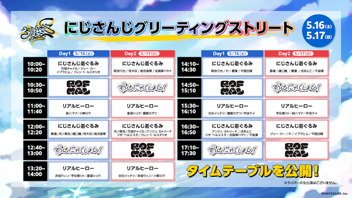 さらに、大人気の着ぐるみ&リアルヒーローが登場する「にじさんじグリーティングストリート」および、「ラジオブース〜FM2434〜」のスケジュールも公開!会場を余すことなく楽しめる魅力が満載となっています。