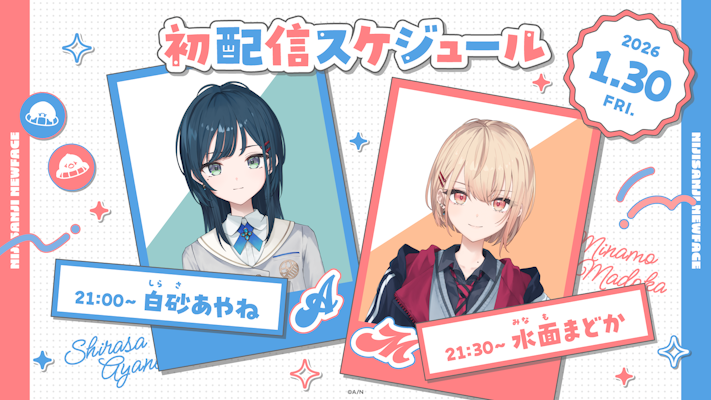 YouTubeでの初配信は各ライバーのチャンネルにて、2026年1月30日(金)21:00よりリレー形式で行います。白砂あやね、水面まどか2名の初配信をぜひお楽しみください。