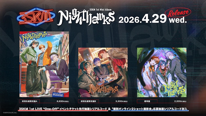 その他、1st Mini Album「Nighthawks」に関する商品・特典情報は、以下HPの情報をご覧下さい。