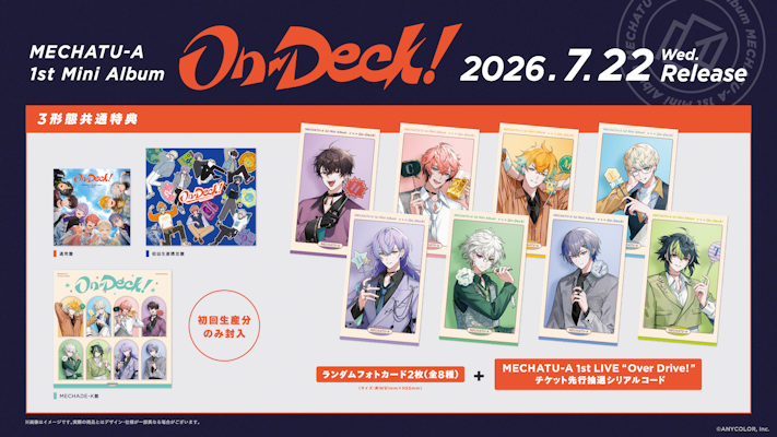当社が運営するバーチャルライバーグループ「にじさんじ」所属VTuberである佐伯イッテツ、赤城ウェン、宇佐美リト、緋八マナ、星導ショウ、叢雲カゲツ、小柳ロウ、伊波ライからなるユニット「MECHATU-A」が、1st Mini Album「On-Deck!」を2026年7月22日(水)に発売することが決定!本日2026年4月28日(火)21:30より順次予約開始!
