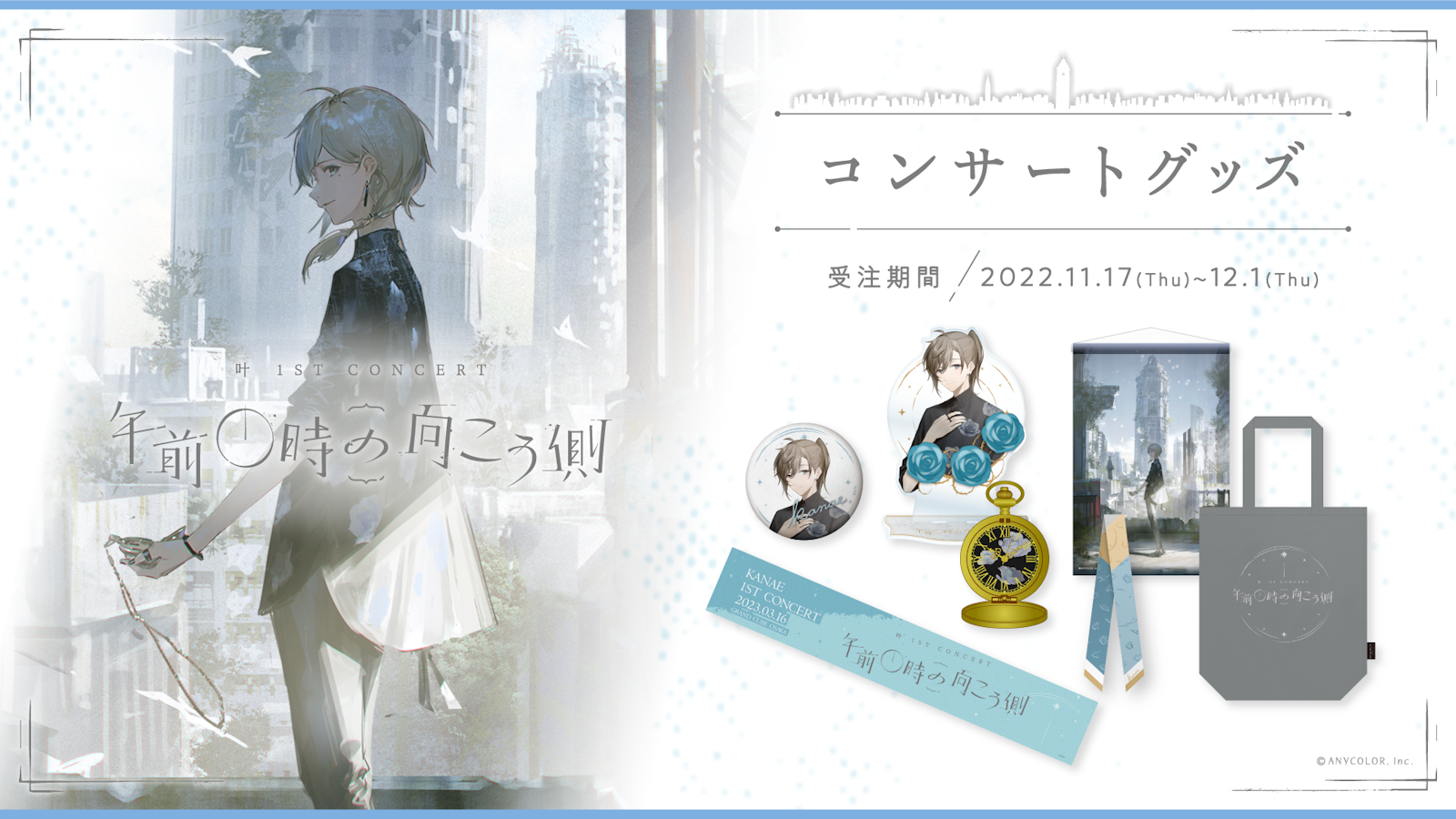 ANYCOLOR株式会社(本社:東京都港区 代表取締役:田角陸、以下「当社」)が運営するVTuber / バーチャルライバーグループ「にじさんじ」は、2022年11月17日(木)18時からにじさんじオフィシャルストアにて、「叶 1st Concert『午前0時の向こう側』」のコンサートグッズ事前受注販売を開始いたします。