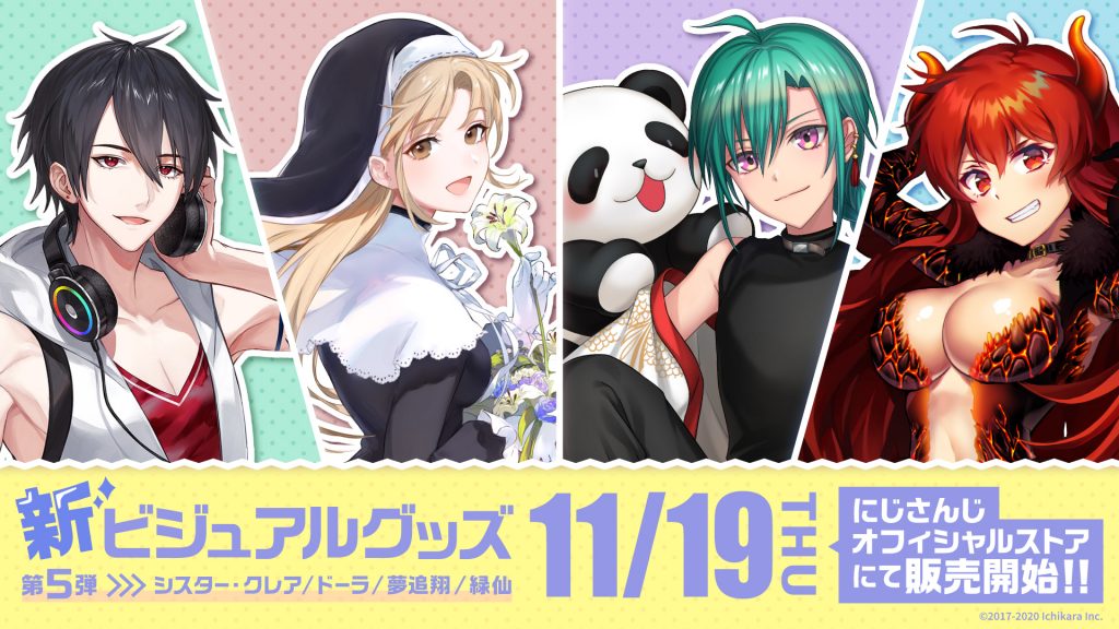 「にじさんじ」ライバー4名(シスター・クレア、ドーラ、夢追翔、緑仙)の新ビジュアルイラストを使用した大判アクリルスタンドとランダム缶バッジの2種類のグッズ販売を2020年11月19日(木)12時より行います。また、今後も新ビジュアルを公開しているライバーのグッズを販売する予定です。
