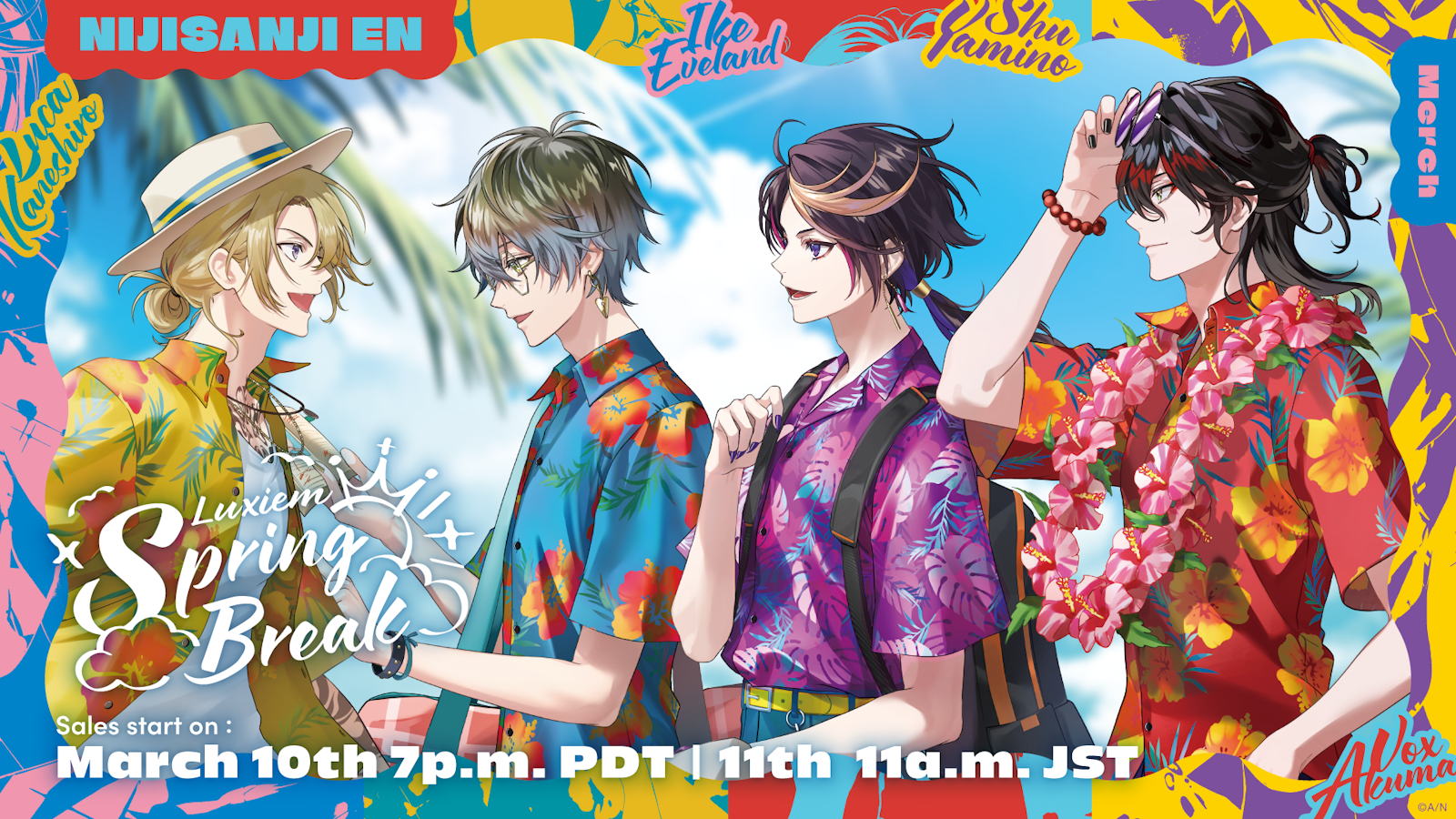 Operated by ANYCOLOR Inc., NIJISANJI EN announces the release of new theme merchandise featuring the VTuber group “Luxiem”, which comprises Vox Akuma, Luca Kaneshiro, Ike Eveland and Shu Yamino. “Luxiem Spring Break” merchandise will be available on the NIJISANJI EN Official Store starting from March 10 (Mon) 19:00 PDT!