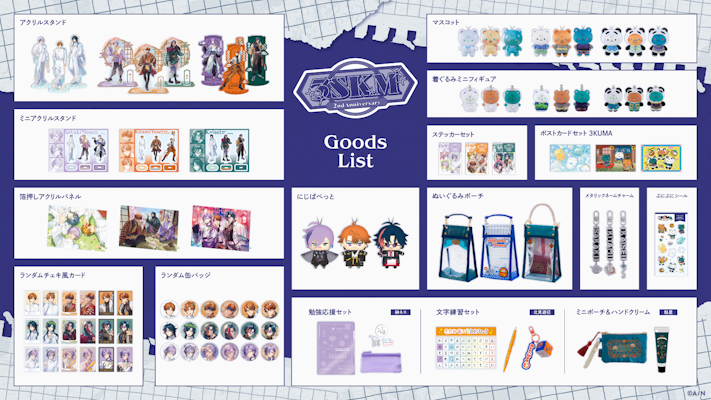 グッズラインナップは、アクリルスタンド、ミニアクリルスタンドセット、箔押しアクリルパネル、ポストカードセット、ランダムチェキ風カード、ランダム缶バッジ、ステッカーセット、メタリックネームチャーム、ぬいぐるみポーチ、にじぱぺっと、ぷにぷにシール、着ぐるみミニフィギュア、マスコット他、3SKMメンバーそれぞれの個別グッズを含む全16種類。