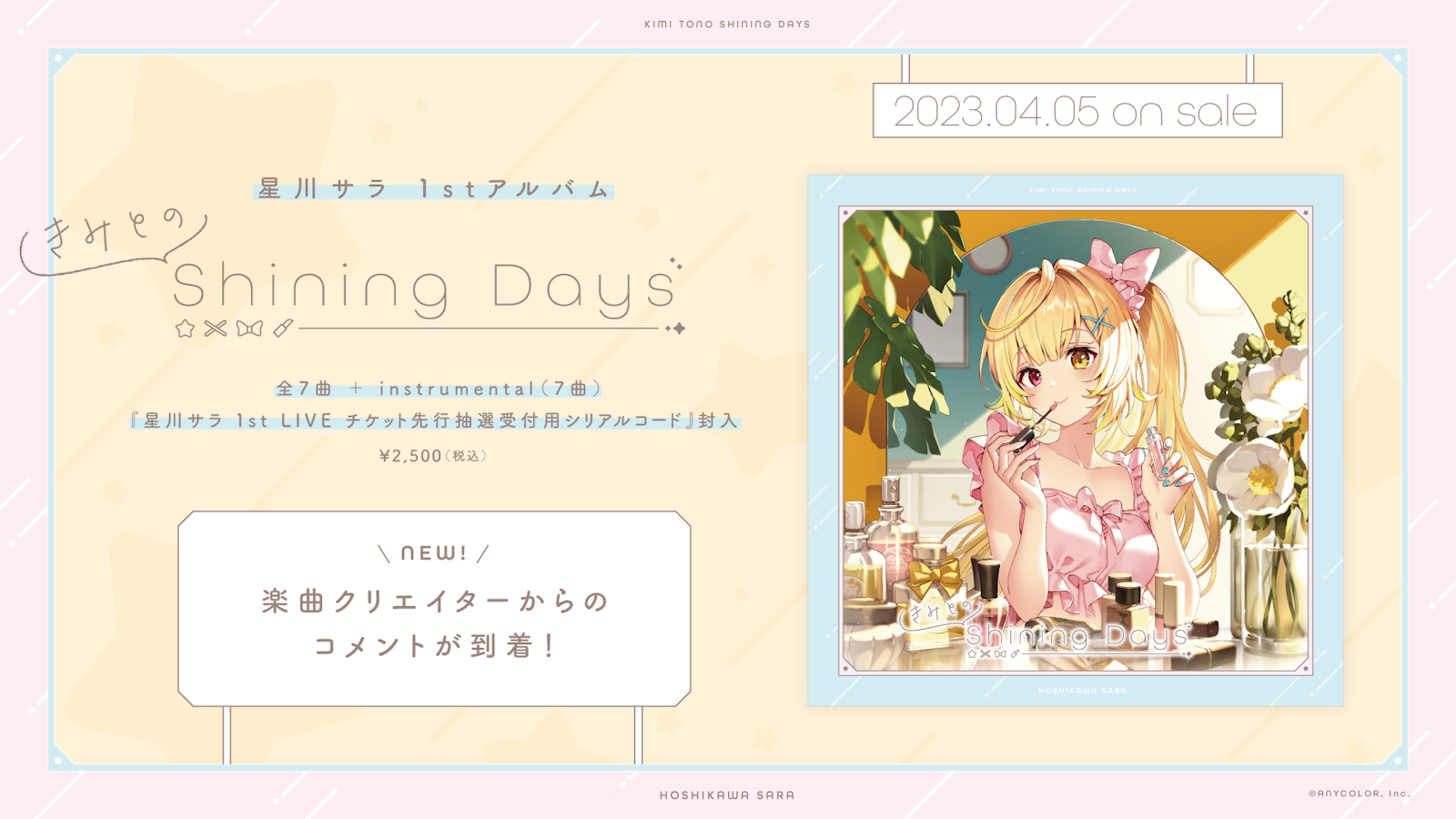 2023年4月5日(水)発売予定、星川サラ 1stアルバム『きみとのShining Days』の楽曲クリエイターよりコメントが到着!
