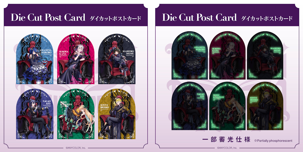 天宮こころ、健屋花那、長尾景、ましろ爻、NIJISANJI ENからはサニー・ブリスコー、ぽむ れいんぱふが参加する「にじさんじハロウィン2022」グッズのラインナップは、ランダムチェキ風カード、アクリルスタンド、ダイカットポストカード、メタルキーホルダー、折りたたみミラーの5種類。