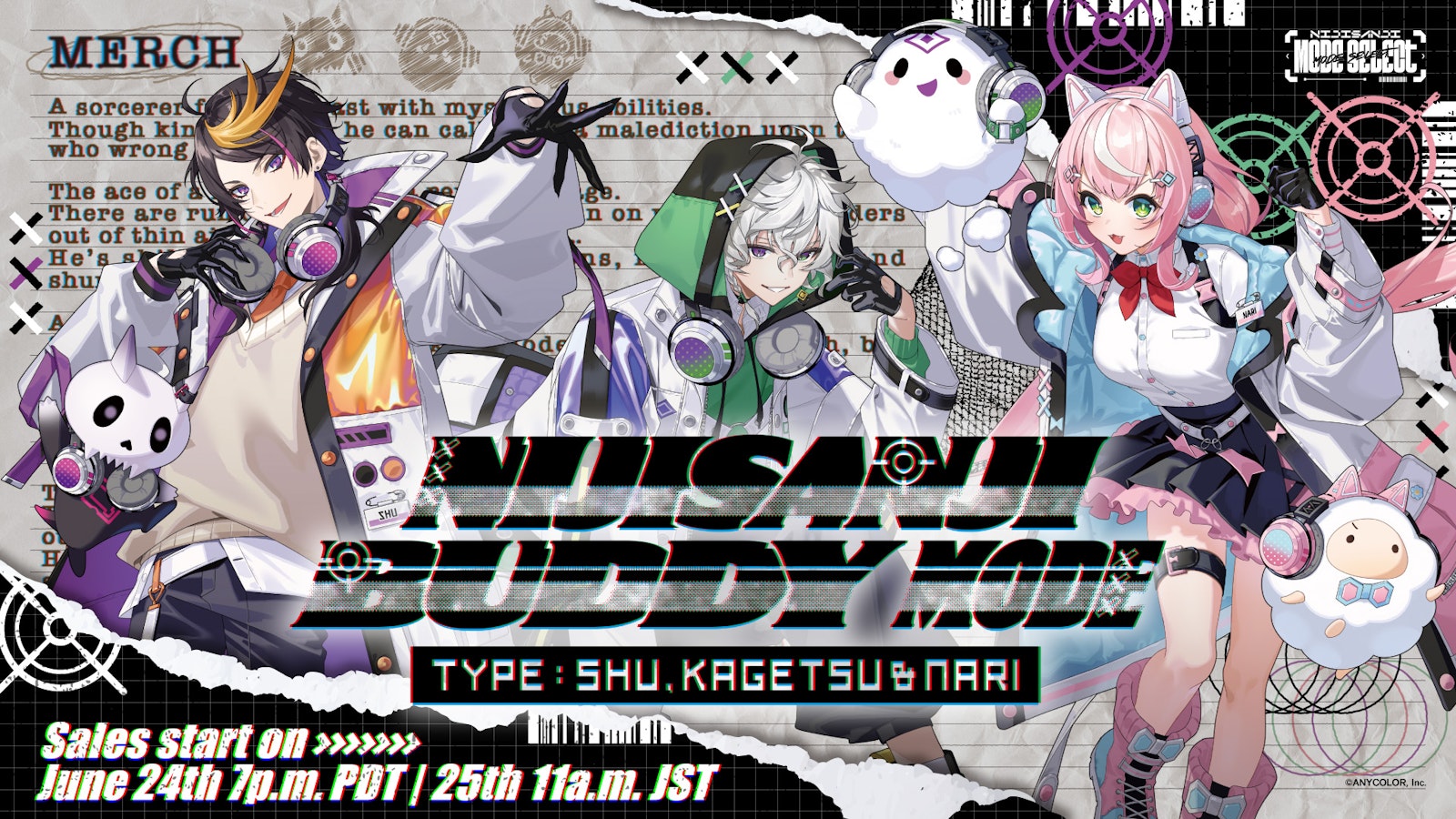 Operated by ANYCOLOR Inc., NIJISANJI EN announces the release of new theme merchandise featuring the NIJISANJI and NIJISANJI EN Livers. “NIJISANJI Buddy Mode Type: Shu, Kagetsu & Nari” merchandise will be available on the NIJISANJI EN Official Store starting from June 24th (Tue), 19:00 PDT!