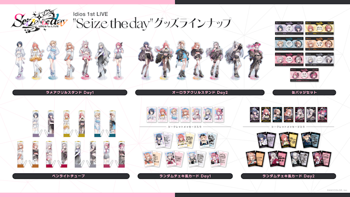 「Idios 1st LIVE "Seize the day"」グッズは、2025年10月8日(水)18時から、にじさんじオフィシャルストア(https://shop.nijisanji.jp)にて販売いたします。
