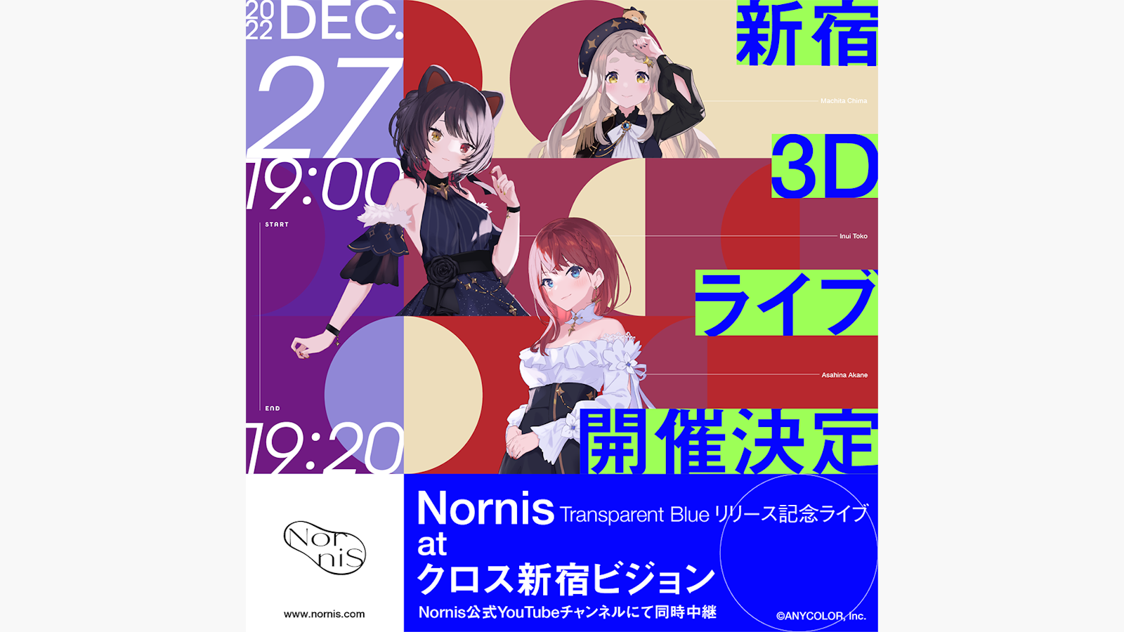 ANYCOLOR株式会社(本社:東京都港区 代表取締役:田角陸、以下「当社」)が運営するVTuber / バーチャルライバーグループ「にじさんじ」の『Nornis』(読み:ノルニス)が、2022年12月28日(水)に発売予定の1st Single『Transparent Blue』(読み:トランスペアレント ブルー)の発売を翌日に控えた2022年12月27日(火)に『Nornis 「Transparent Blue」リリース記念ライブ at クロス新宿ビジョン』を開催することを発表いたしました。