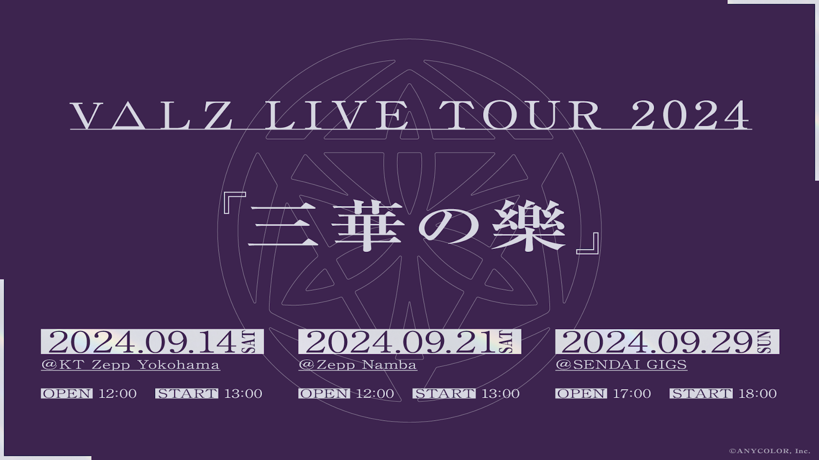 そんなVΔLZは2024年4月2日に4周年を迎え、4周年記念配信「【重大告知あり!?】VΔLZ4周年記念生配信SP」にて初のライブツアー「VΔLZ LIVE TOUR 2024『三華の樂』」の開催を発表しました!