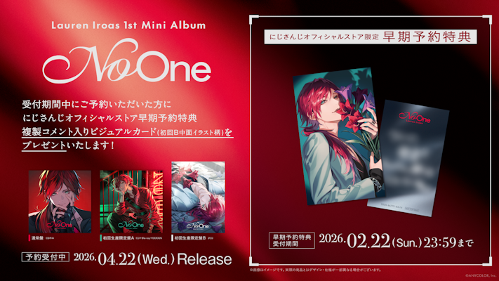 当社が運営するバーチャルライバーグループ「にじさんじ」所属VTuber ローレン・イロアスは、1st Mini Album『No One』を2026年4月22日(水)に発売いたします。販売予約は本日2026年1月28日(水)21:10より開始し、現在予約受付中です。